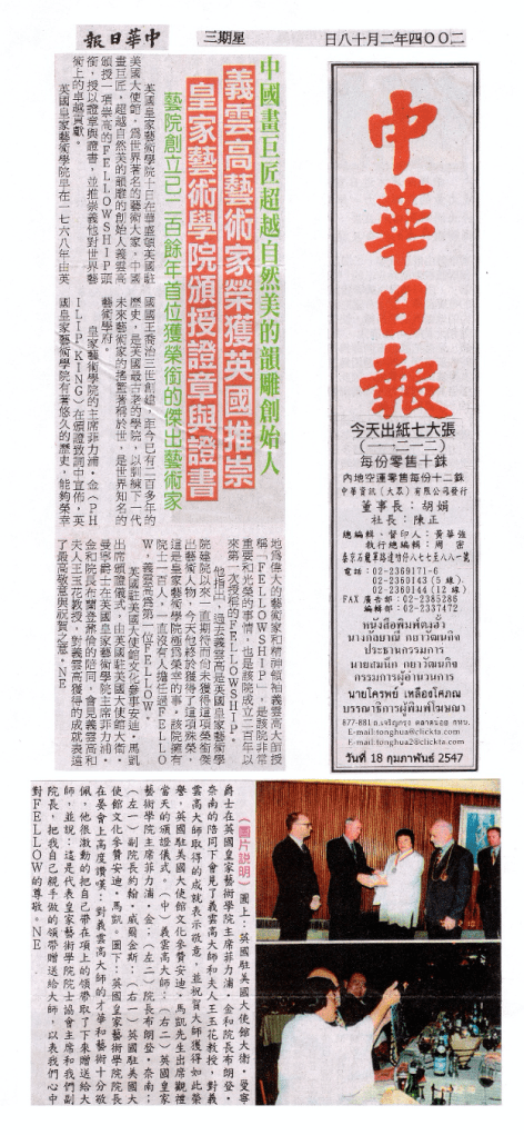英国皇家艺术学院十日在华盛顿英国驻美国大使馆,为世界著名的艺术大家、中国画巨匠、超越自然美的韵雕的创始人 义云高 (H.H. 第三世多杰羌佛 )颁授一项崇高的 Fellowship 头衔,授以证章与证书,并推崇义他对世界艺术上的卓越贡献。